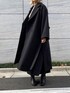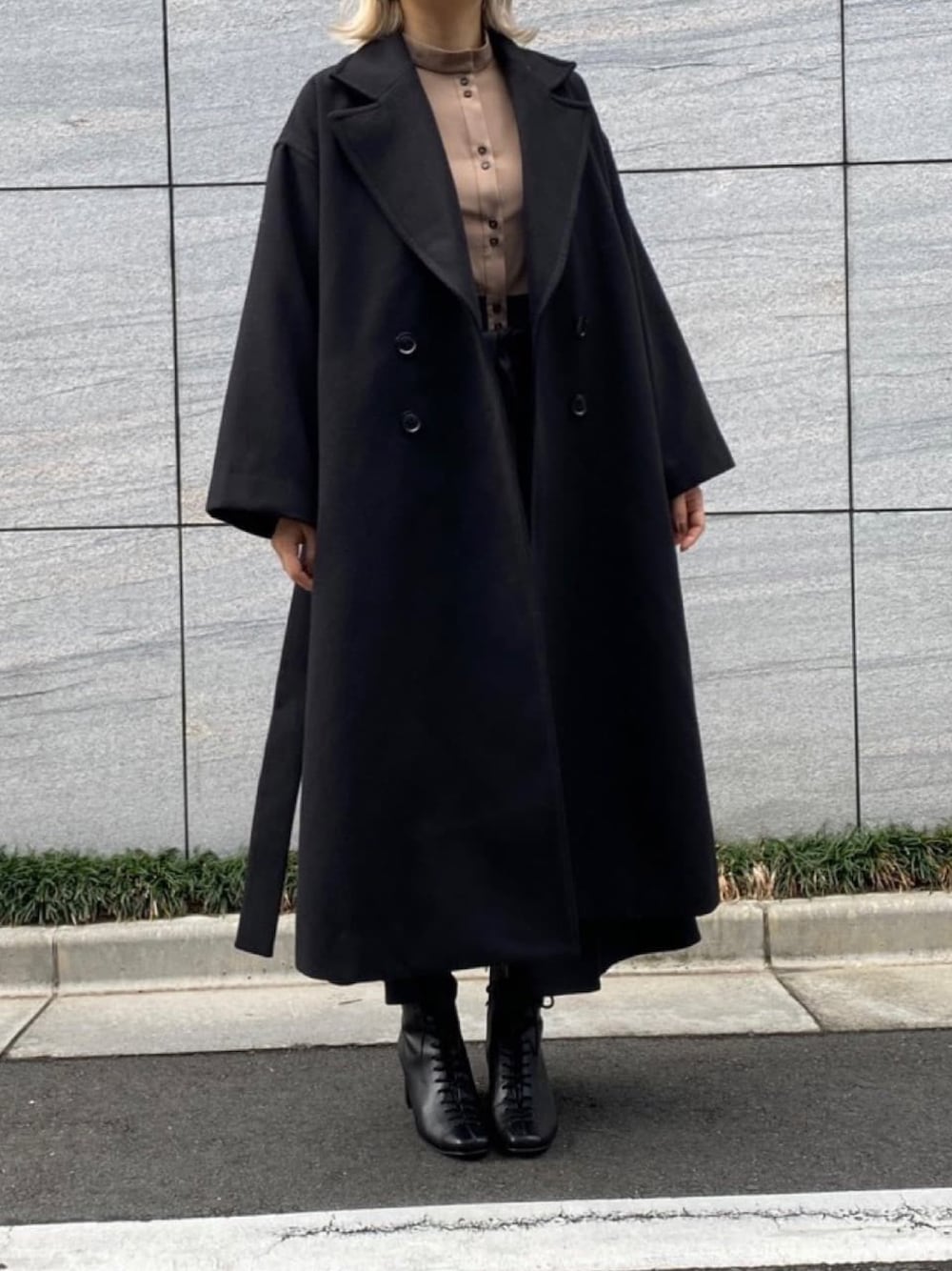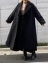 黒配色のワンピースに黒コートを合わせてみました。 ワンピースは、ボタンやスカートの部分、肩フラシーなどが配色でポイントデザインになっています。 コートは全体的にゆるくて、Aラインになっているシルエットが綺麗です。サイドに深いスリットがあるので横からの見え方がとてもオシャレです。