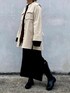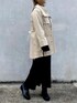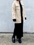 ブラック&ホワイトのコーディネートです。 ブラックのニットワンピースはサイドスリットが深くてロングブーツを合わせるのがおすすめです。 コーデュロイブラウスは肩と胸のタックがフラシになってレイヤード風に見えるし、オーガンジーのウエストベルト、サイドスリットなどがポイントです。