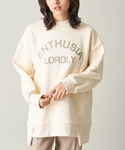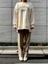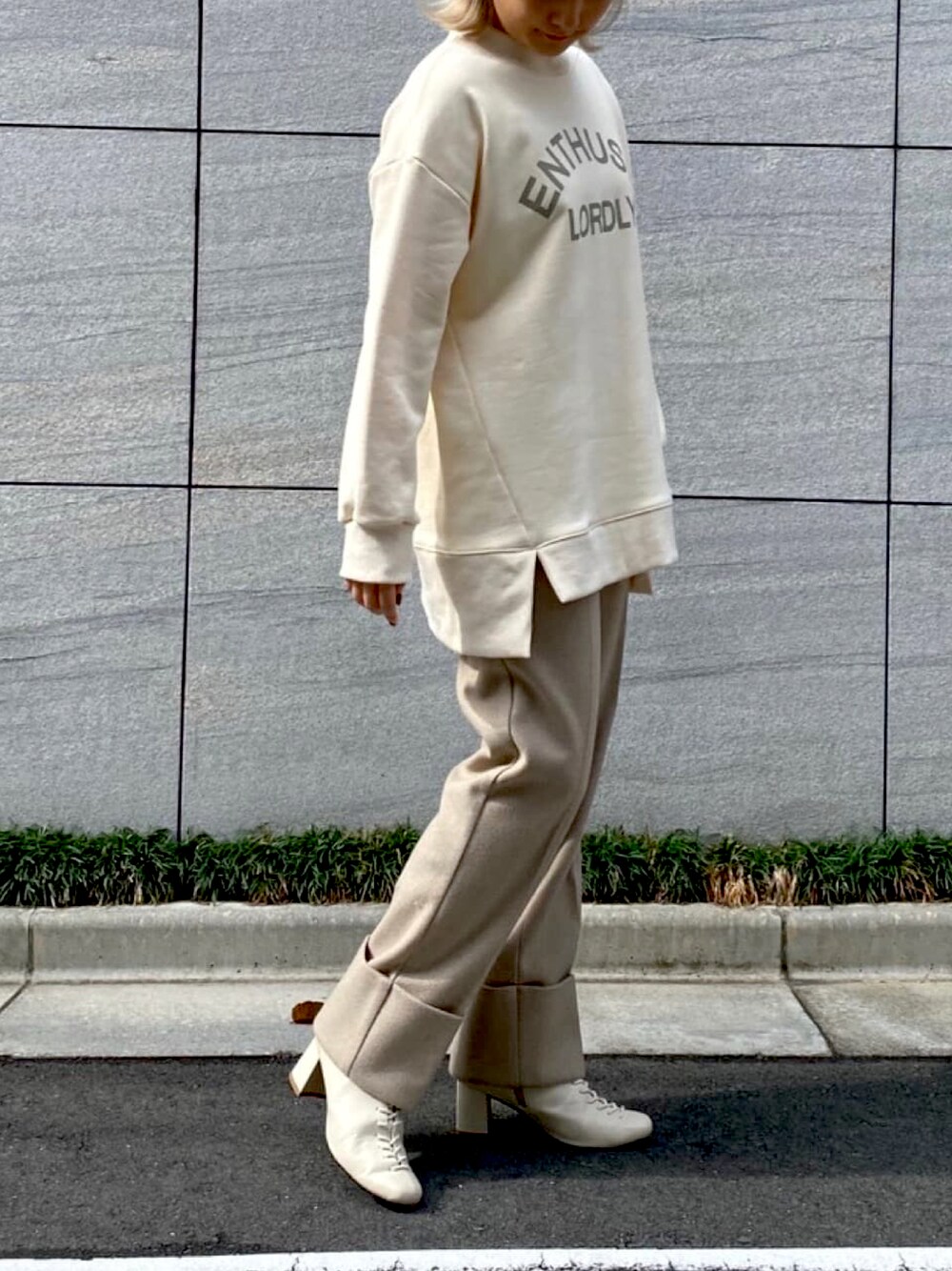 カレッジロゴプリントのスウェットは、ロゴの形や色がさりげなく可愛いです。 脇線の裾部分が前送りになって、前後差があるリブにはスリットまであるデザインです。 パンツはフェイクウールの温かい素材で、ストレートシルエットなので、冬に楽しく着やすいアイテムだと思います。