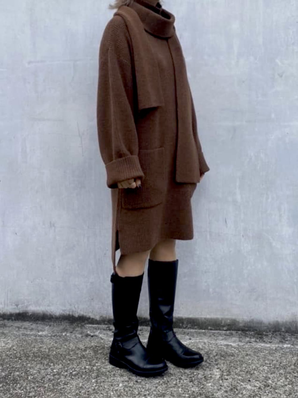 寒い時期に最高なマフラー付きの暖かいニットを着てみました。 前ポイントとサイドスリットがとても可愛いです〜。 丈が長くて一枚だけ着てロングブーツを合わせてもいいしパンツやスカートを合わせてもいいのでマルチコーデができるアイテムです。