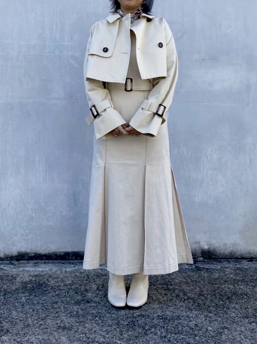 今年トレンドのマーメイドワンピースにセパレートタイプのトレンドコートのジャケットを合わせました。 ワンピースの方は、裾ラインがどても綺麗で、肩紐を後ろで結んで丈の調節もできます。 ジャケットの方は丁度ウエストの上頃の丈感で足が長く見える効果もありますのでおすすめです。