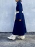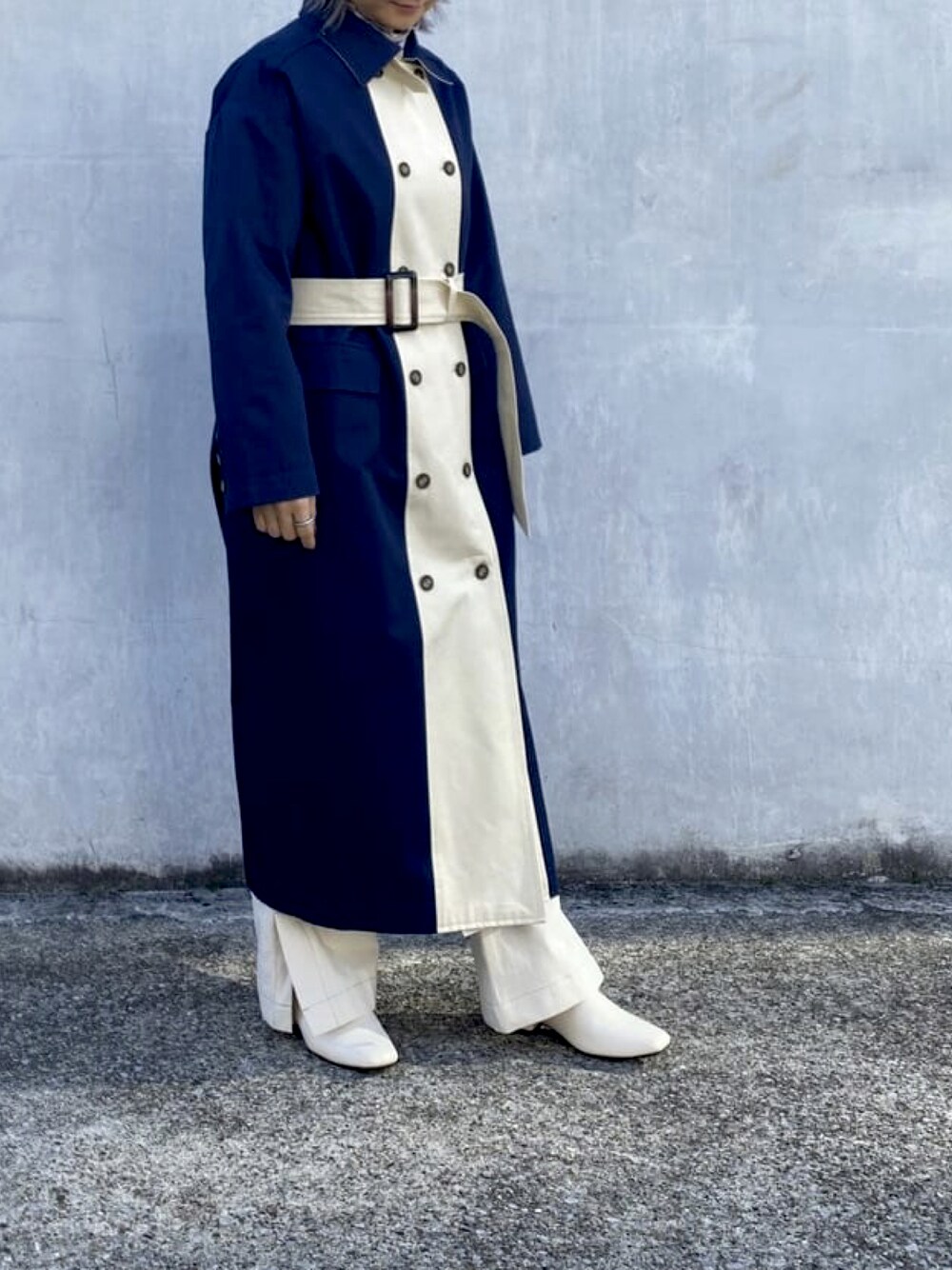 春の新作、バイカラートレンチコートを着てみました。 ネイビーと白の色合わせがどても綺麗です。 さらにベルトも白で、後ろから見てもポイントになってます。 衿にボタンとタブがあるので、スタンドにすると裏側の白色が見えて色んな演出もできます。 色展開は、ネイビーとベージュがあるので、ベージュの方も優しい色味でおすすめです。