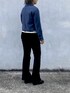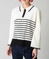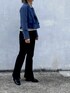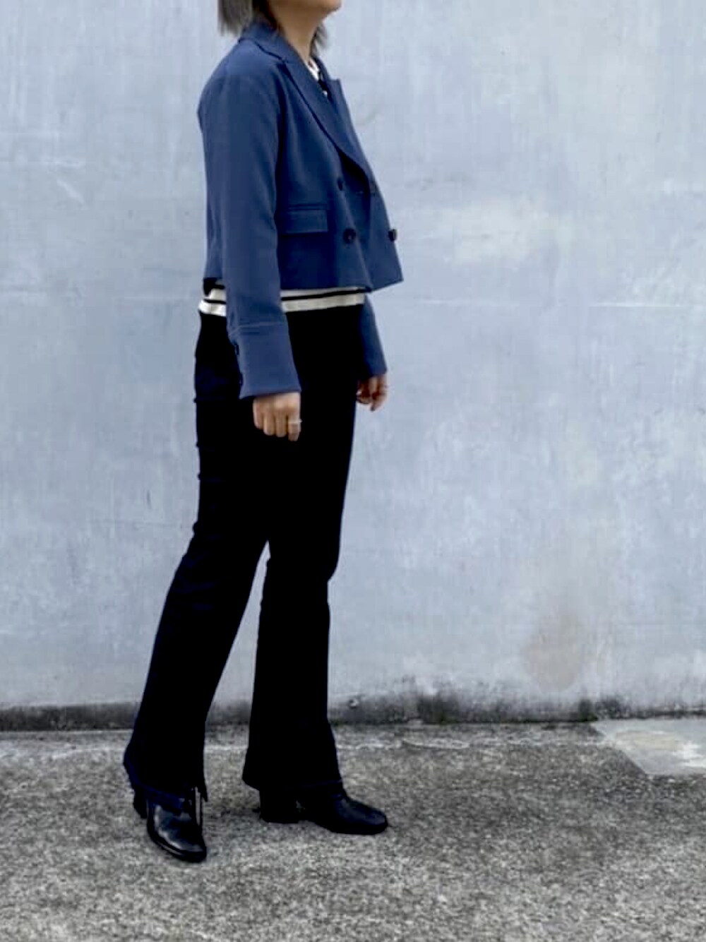ショート丈のジャケットとデニムパンツの合わせです。 中にはゴールドボタン付きのボーダーラガーニットを着ました。 ショート丈のジャケットは足が長く見える効果もあるし、スパン入りのデニムパンツはどんなアイテムにも気軽く合わせられるのでおすすめのパンツです。