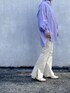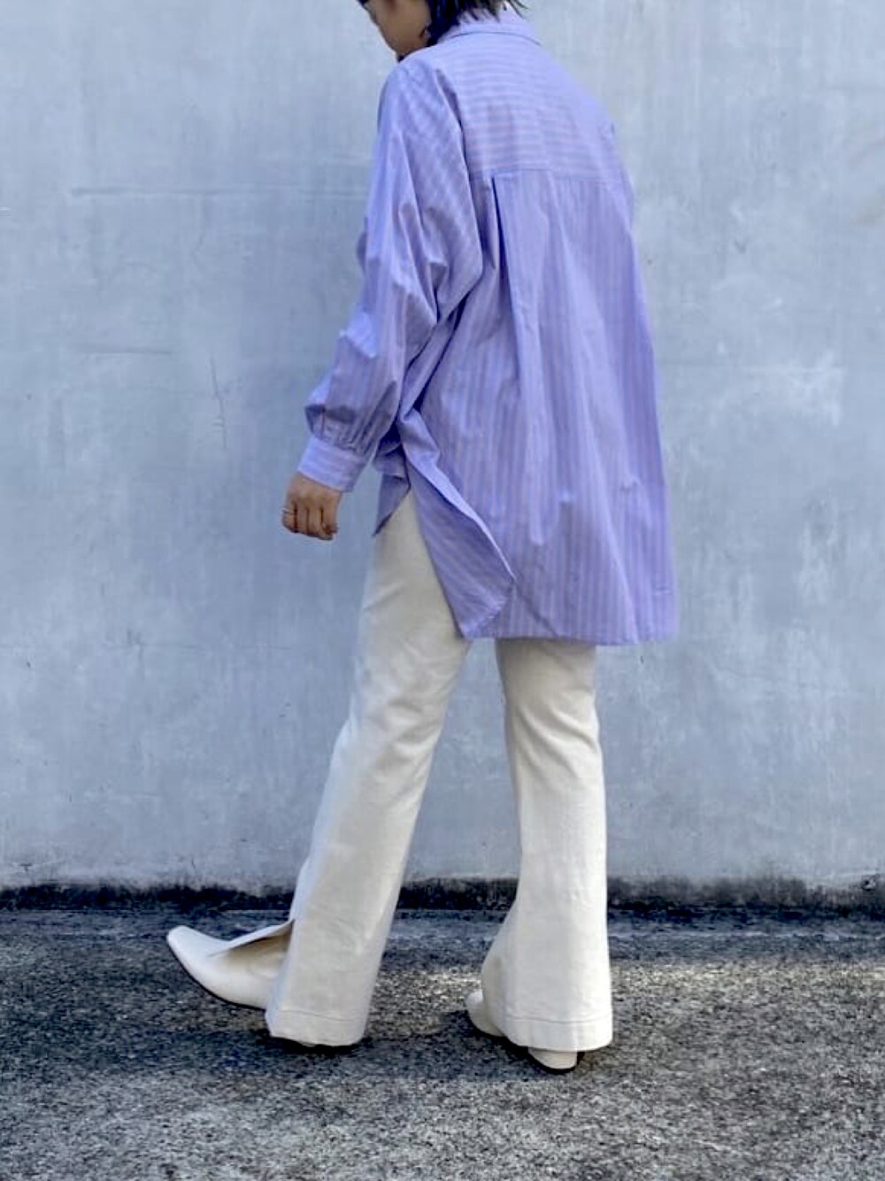 春らしい色味のストラップシャツは、着丈の前後差、サイドスリット、袖ボリュームなどが合わせてとても可愛いです。それに白ボトムのコーデは今年のおすすめ組み合わせです〜。