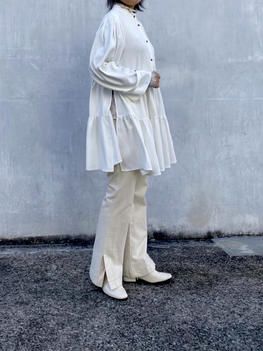 今年SSトレンドのオールホワイトコーデです。 サイドスリット、アンチックゴールドボタン、袖タブで絞りもできるタイプのティアードブラウスは、1枚だけでオシャレな演出ができるアイテムです。 それにサイドベンツありの白パンツを合わせるとガーリーカジュアルで可愛いです〜。