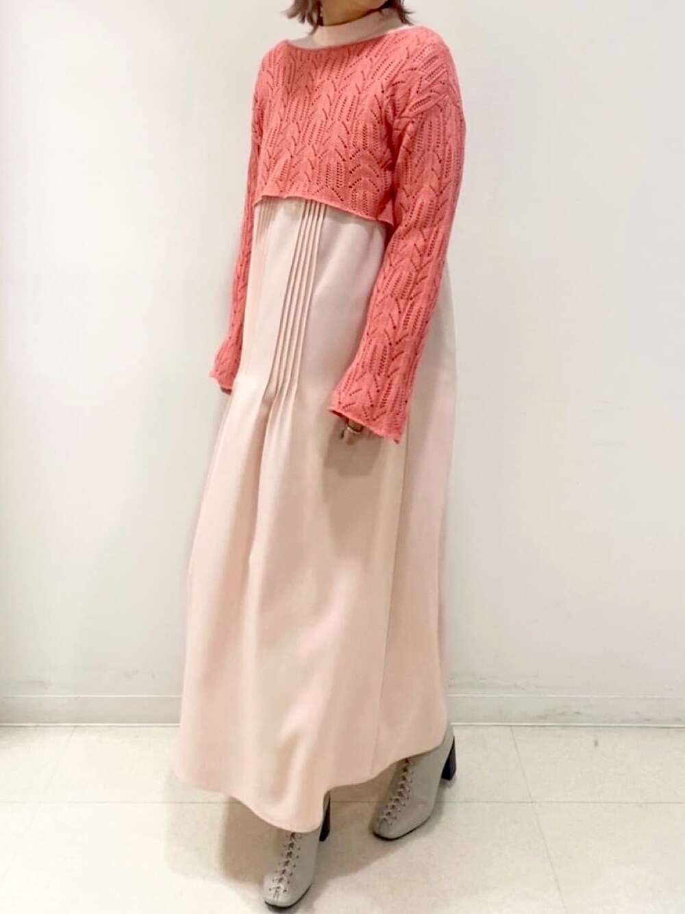 ピンクのワントンコーデです。 中に着ているワンピースは、今のコーデみたいに短丈のトップスと合わせると前はピンタックが、後ろ襟にはリボンがあるので可愛いし、一枚だけ着てもいいアイテムなのでおすすめです! トップスのニットは、透かし感と色がとても良いです。