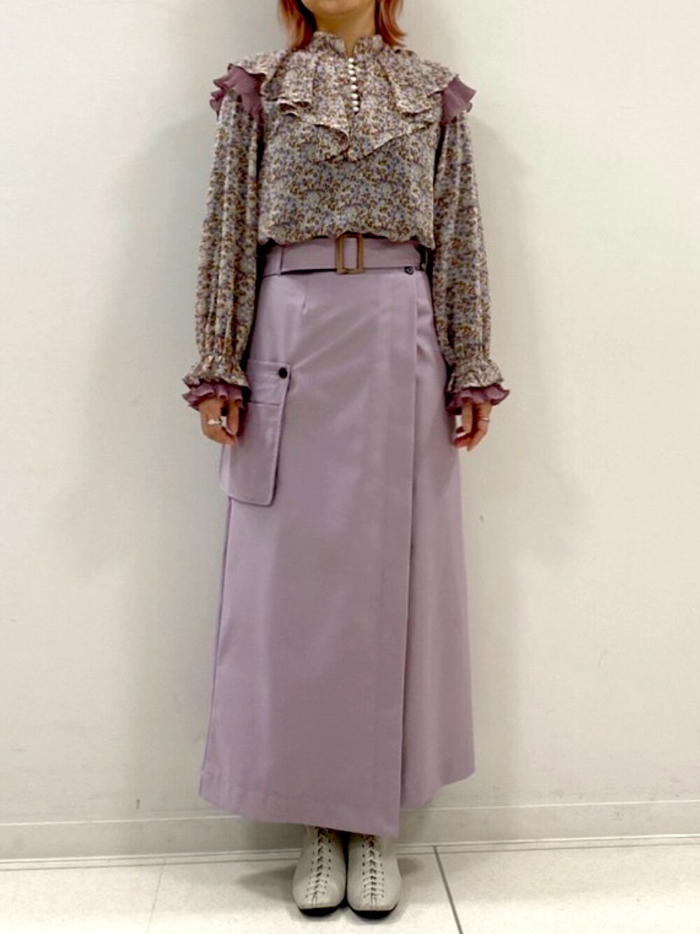 花柄フリルブラウスにラベンダーラップスカートのコーデです。 全体にパープルカラーのワントンコーデですが、小花柄がポイントになって、共地ベルト付きのスカートは、取り外せるポケットやセンターバックの金属ファスナーがオシャレです〜。