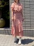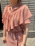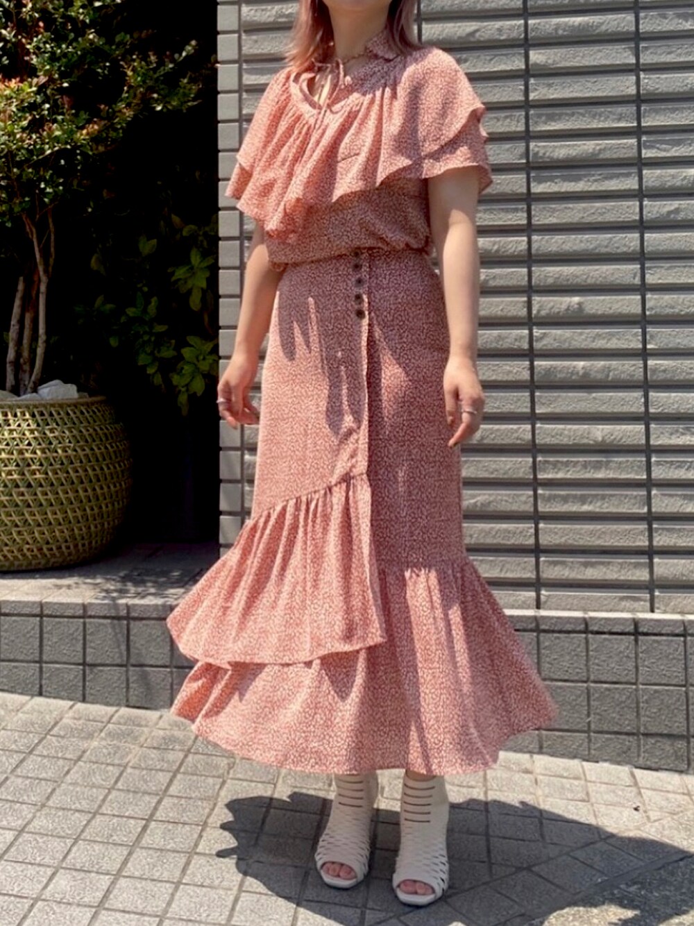 チビヒョウ柄のブラウスとスカートセットアップです。 フリルがブラウスもスカートにもあってワンピース見えの足が長く見える効果もあります。 キーネックに細い紐をリボンにしても垂らしても可愛いです。 イレギュラーハムラインとウエストのボタンまでガーリーな感じで、後ろウエストゴムがあるので気楽にはけます。