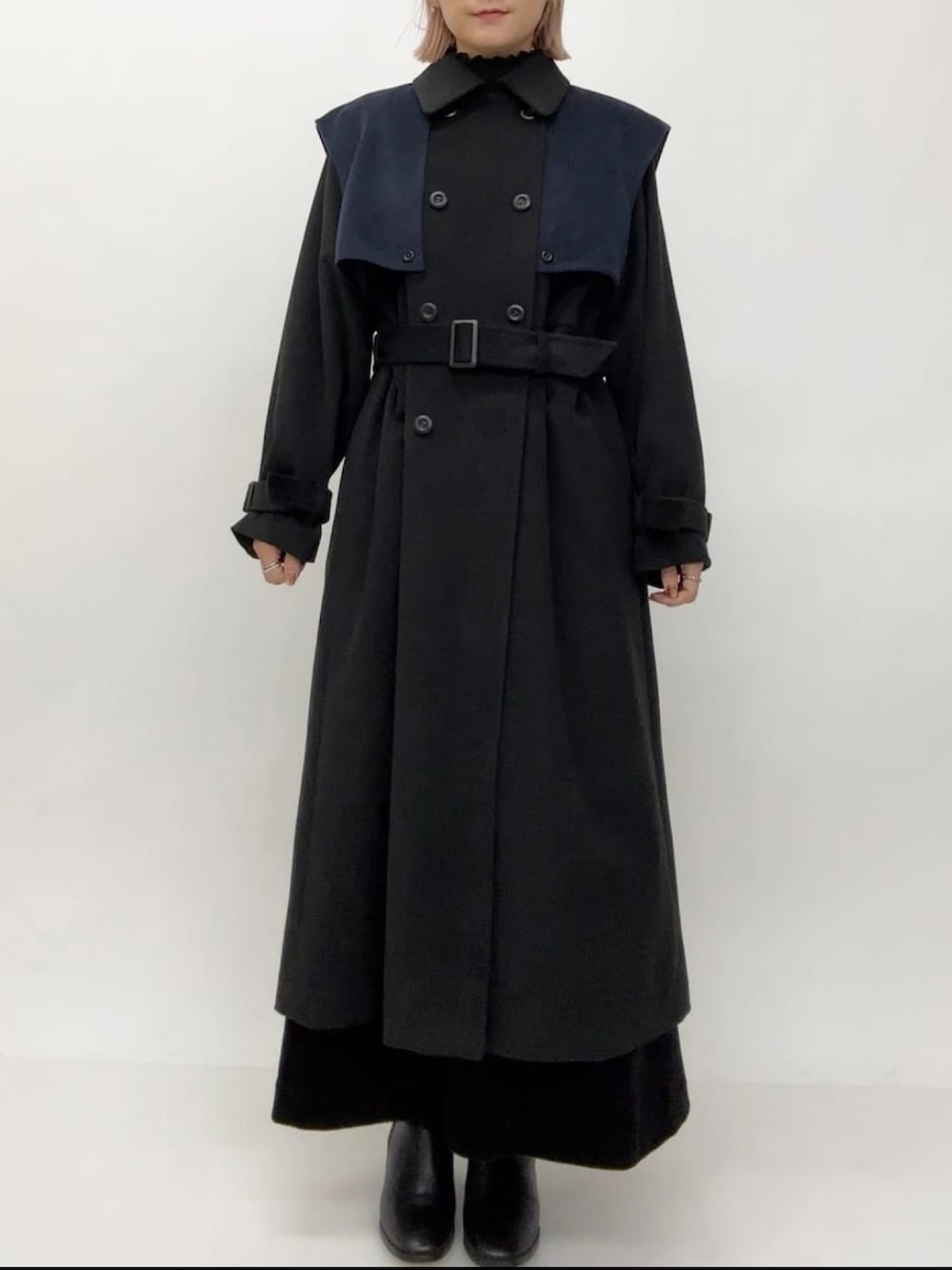mintpinkのチェスターコート「バイカラーケープフェイクウールロングコート」を使ったコーディネート