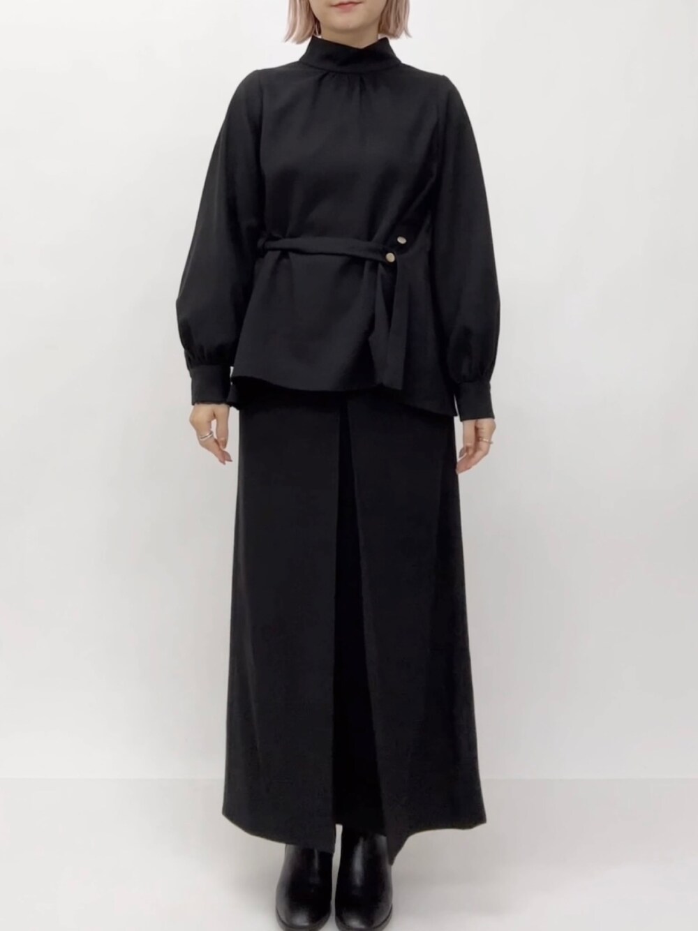 ボウタイブラウスとスカートのセットアップコーデです。 ブラウスは、ボウタイを取り外せるタイプで、 ウエストの紐は後ろを通しているので、絞って釦で長さを調節できます。 スカートはセンターフロントがボックスタックになっていて、後ろスリットがあるので 歩きやすいし、かわいいシルエットです。 セットアップにするとフォーマルなところにも似合うし、 単品ぞれぞれもほかのアイテムともコーデしやすいのでお勧めです。