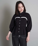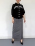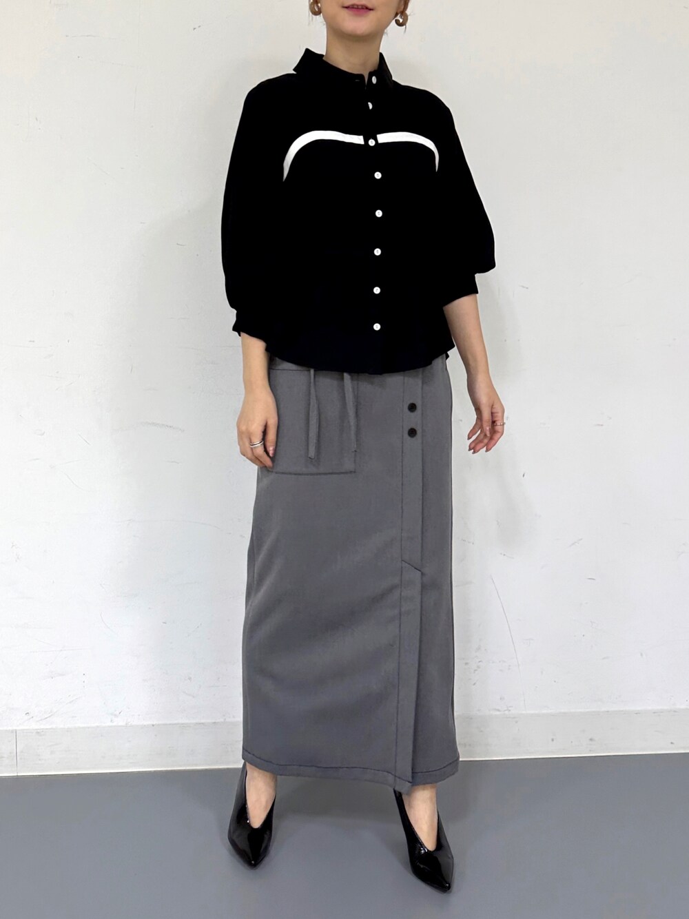 今の時期に着やすいブラウスのコーデです。 ビスチェ風に見えるバイカラーのブラウスで、 グレースカートを合わせてモノトーンコーデです。