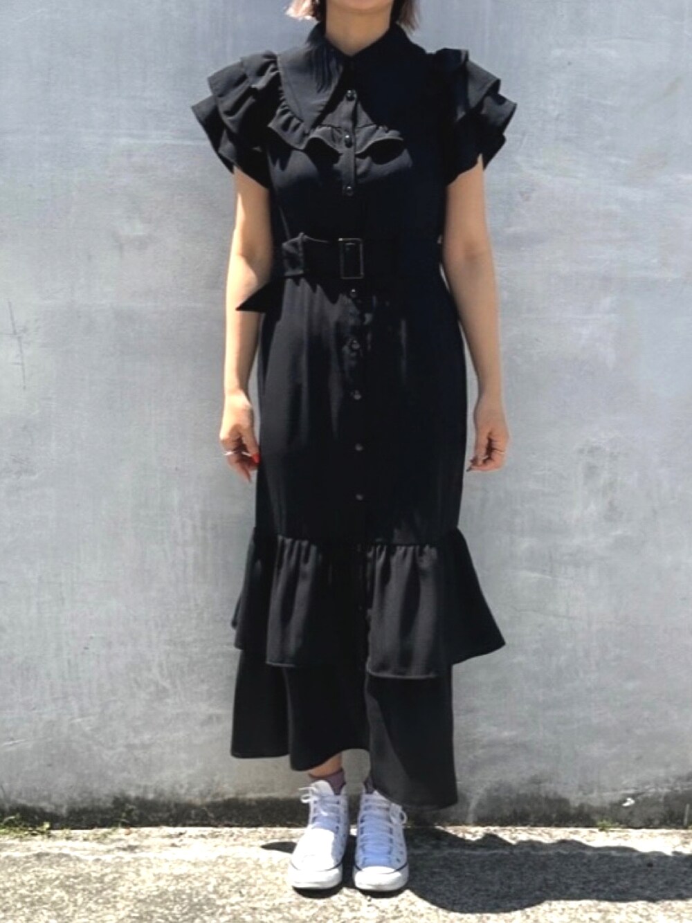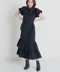 肩フリルがポイントのワンピです。 スカートはセミマーメイドシルエットでティアードのフリルが裾まで可愛くて気持ちいいアイテムです。