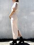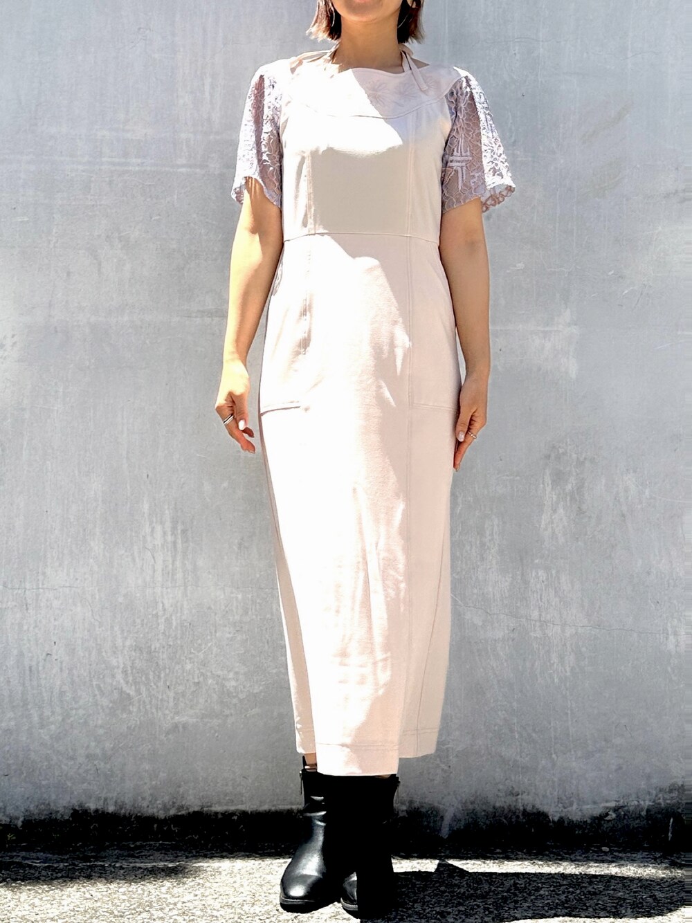 オフショルダーワンピを着てました。 後ろネックで紐結びでポイントになって、バイカラーのレースが袖ドッキングになってます。 襟元には同色刺繍が入っていて可愛いです!