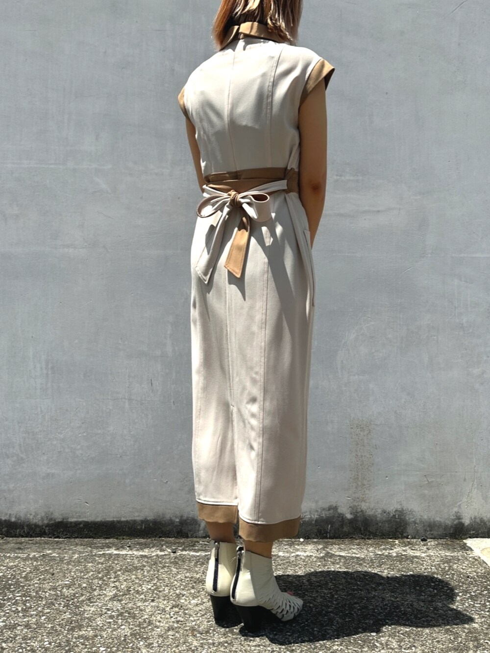 mintpinkのワンピース「麻ライクバイカラージップアップナローワンピース」を使ったコーディネート