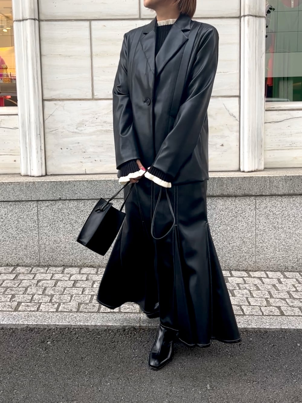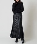 レザーのセットアップです。 ジャケットは裾にドットボタンのスリットで開けて着ることもできるし、シンプルなシルエットで羽織りやすいアイテムです。 スカートは マーメイドで綺麗なラインが可愛いです。