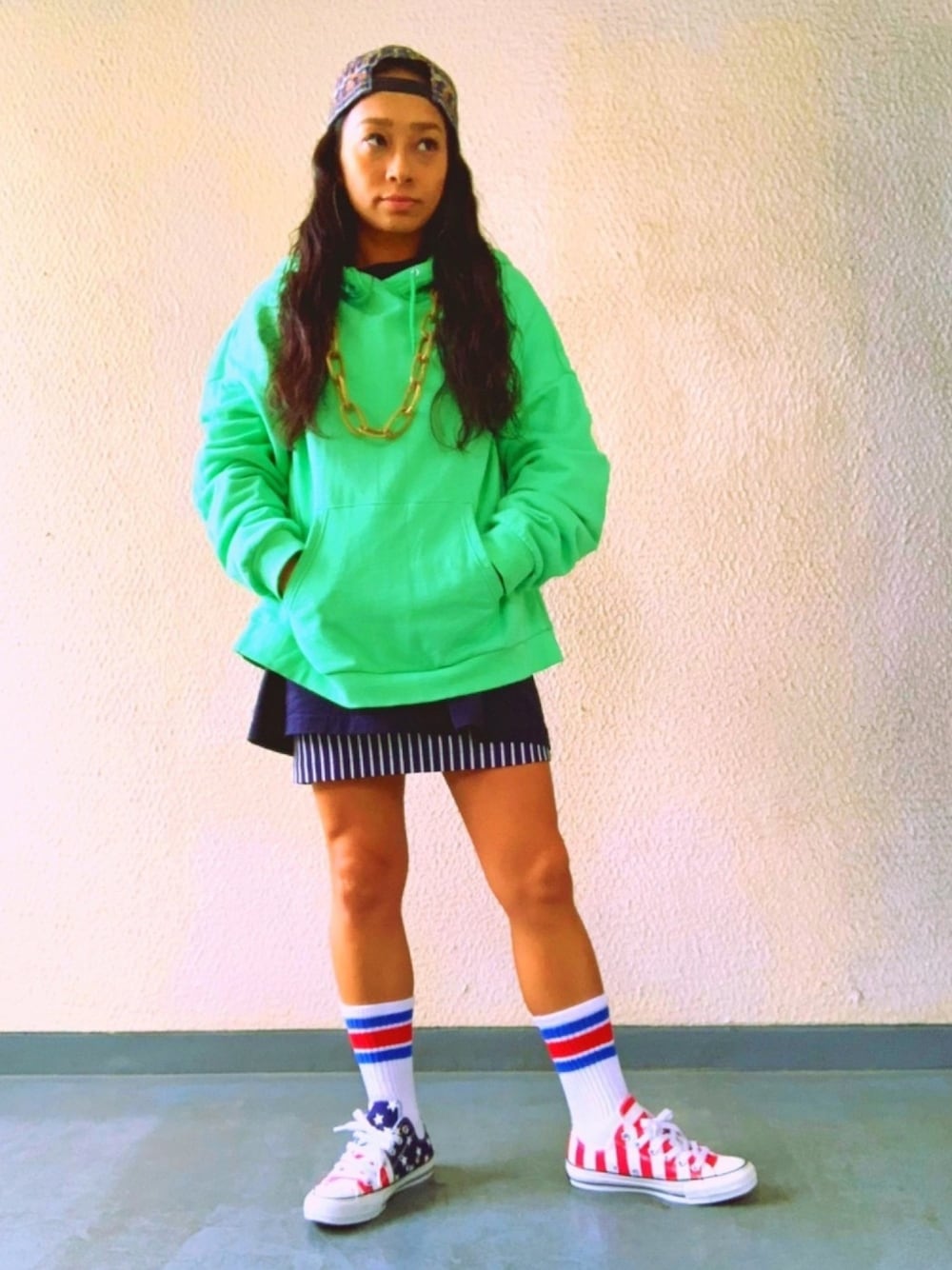 ちょっといかつめスタイルだけど カラーチョイスとミニスカで ポップにかわいくしたつもり◎ 顔が濃いから派手な色似合うよ笑