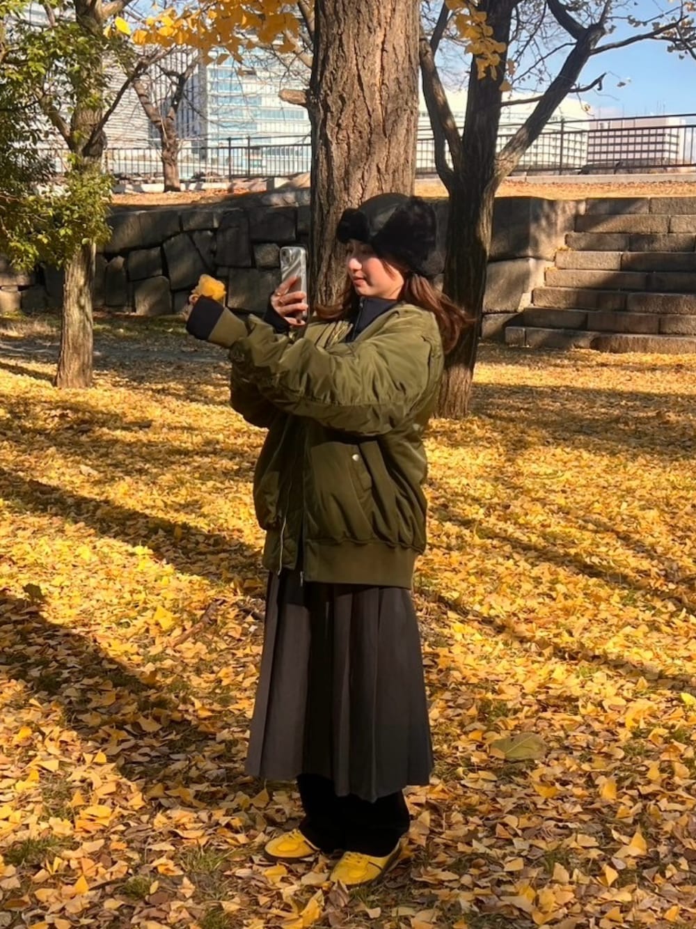 スカートとスラックスのレイヤードに初挑戦 重ね着いっぱいしてるけど、フライトキャップで目線を上に持っていくことでスタイルアップに アクセントにイエローをプラス たくさんのコーデ載せてます▷▶@k_mio4070