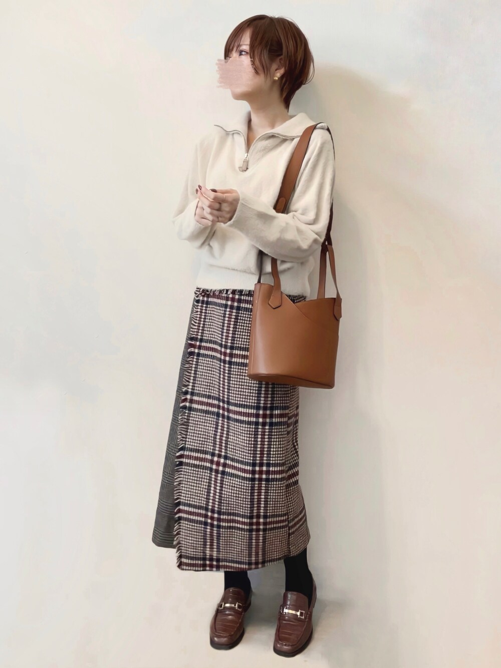 みみみのニット/セーター「モヘアシャギーハーフジップニット」を使ったコーディネート