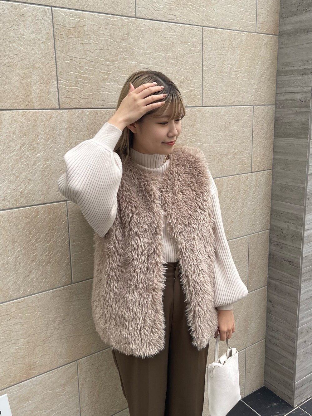 ○ニット ゆるっとした袖ボリュームが女性らしく ○ベスト ヒップがすこし隠れる丈感で、プードルのファーが上品らしさとこなれ感をだしてくれます! ○パンツ さらっと履けるパンツ オールシーズン履ける生地感で楽に履いていただけます!