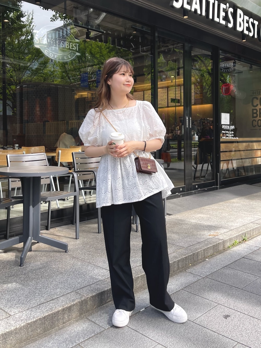 レースのペプラムが女の子らしいので、スラックスとスニーカーでカジュアルさをプラスしました! 暑くてすずい服がいいけどかわいくオシャレなアイテムを着たいオススメしたいです!! 風通しがいいので熱がこもることもなくさらにレース×ペプラムが女の子らしくオシャレにしてくれます!