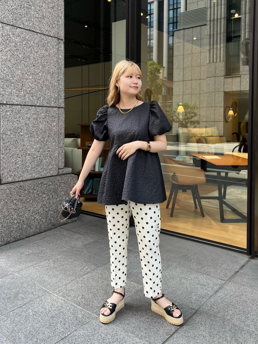 ブラックなので大人っぽく着ていただけます!! ドットパンツや細身のボトムスとの相性抜群です! テーパードは158cmでPMサイズ着用しています!