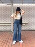 シンプルコーデ 黒のハート刺繍が入ったTシャツ 大きな刺繍じゃないので、どんなコーデにも相性よく!ハートが見えたときとても可愛いいです!! ハイウエストで履けるデニムと合わせてよりスタイルアップに!