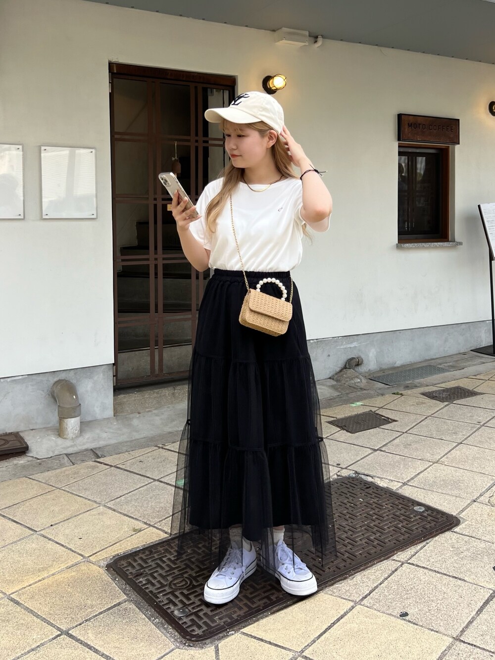白黒コーデ チュールの揺れる感じが可愛くシンプルなコーデでも映えてくれます!! 程よいサイズできれるハートTシャツ 着用アイテム