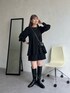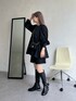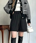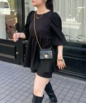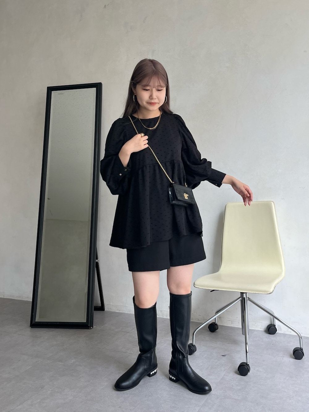ドットペプラムとショートパンツを合わせてオールブラックコーデ! ロングブーツにもパールがありポイントです!! オールブラックでもドットやショートパンツで程よい肌見せなどで重たくならないのでオススメです!