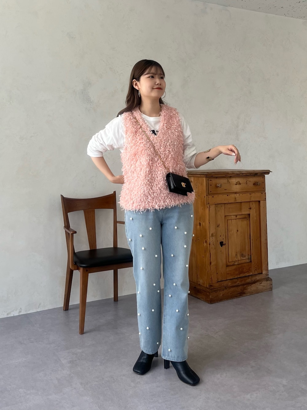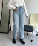 ピンクがアクセントになるコーデ パール付のデニムなので、より女の子らしさをプラスしてくれます!! ロンTやデニムなのでカジュアル要素も甘すぎないのもポイントです!