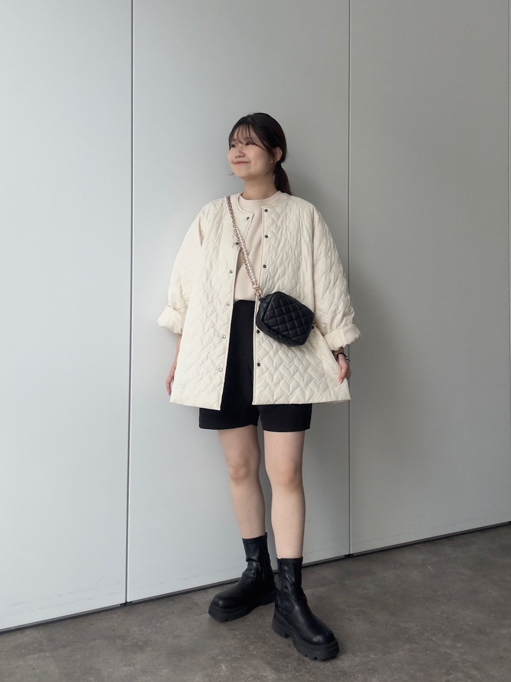 キルティングブルゾンコーデ! スウェットにショートパンツを合せました! ゆるっと着れて大人カジュアルに! ショートパンツの短すぎなく着やすい丈感です! 158cm着用 トップス:M ボトムス:S シューズ:L