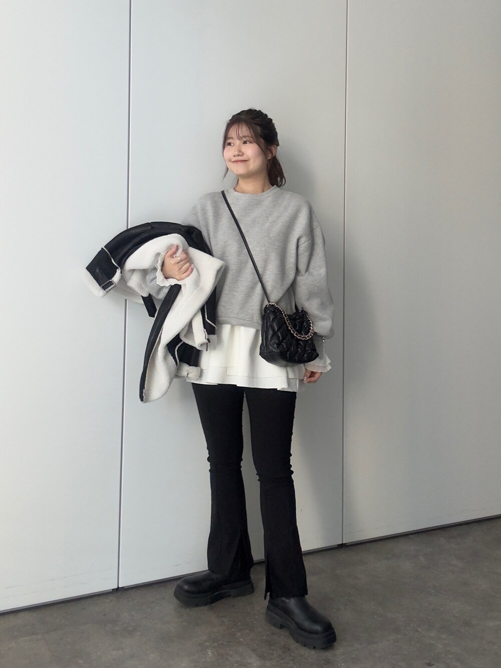 大人カジュアルコーデ! スウェットに ペプラムロンTをレイヤードすると 骨盤周りカバーしてくれるので 細みのパンツとも合わせていただけます!! 158cm着用 トップス:M ボトムス:L シューズ:L