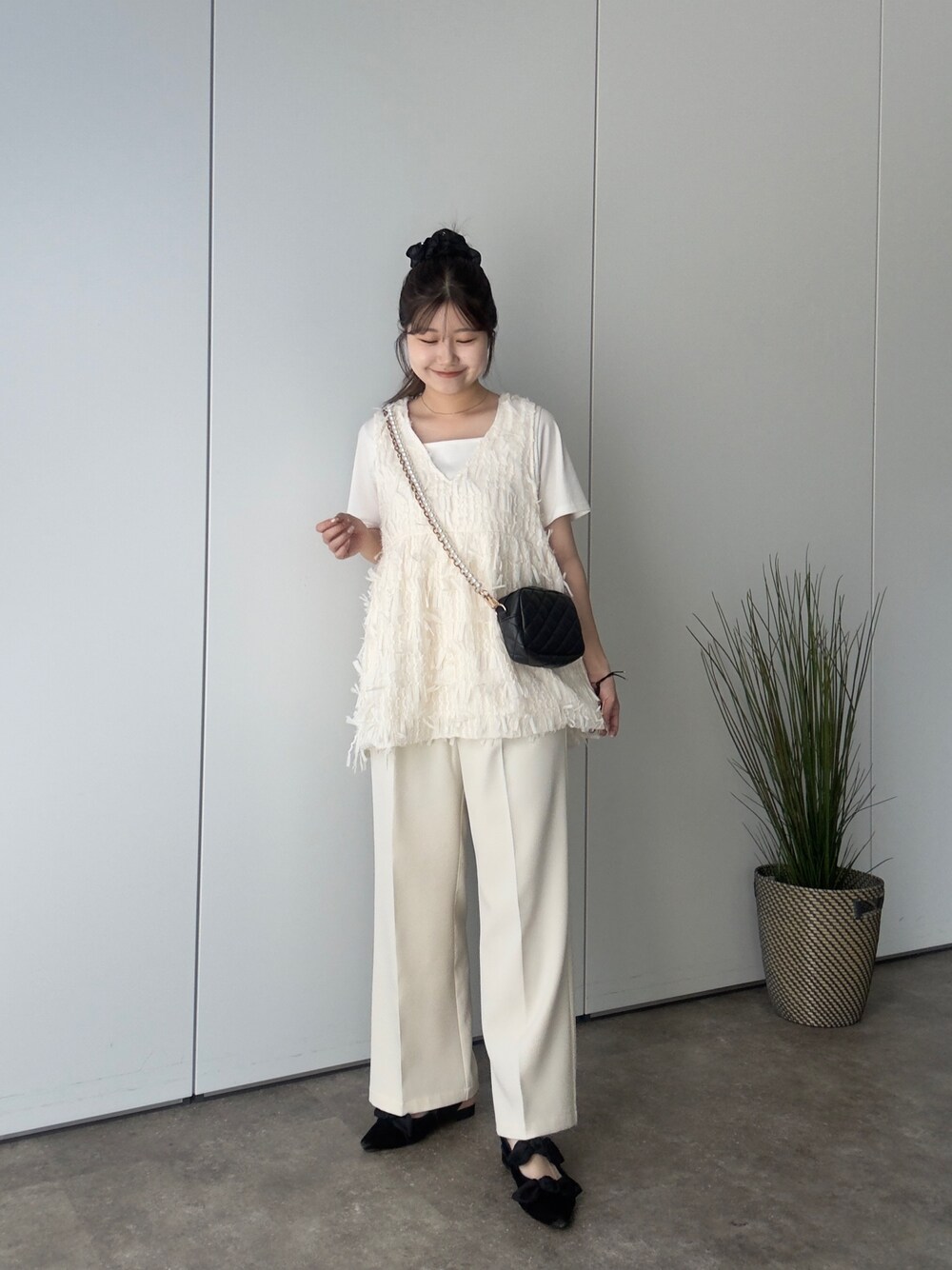 ワントーンコーデ! フリンジベストにタックパンツを合わせました! タックパンツでキレイめに!! フリンジが華やかにしてくれます! 158cm着用 トップス:M ボトムス:PM シューズ:L