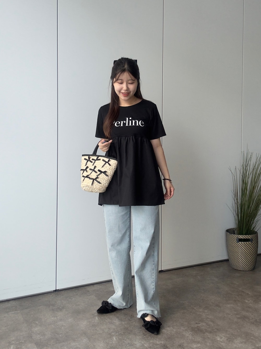 大人甘めカジュアルコーデ! Tシャツにデニムを合わせました! ゆるっとパンツでもダボッ見えせず着ていただけます!! ペプラムなので甘さもプラスしてくれます! 158cm着用 トップス:M ボトムス:L シューズ:L