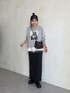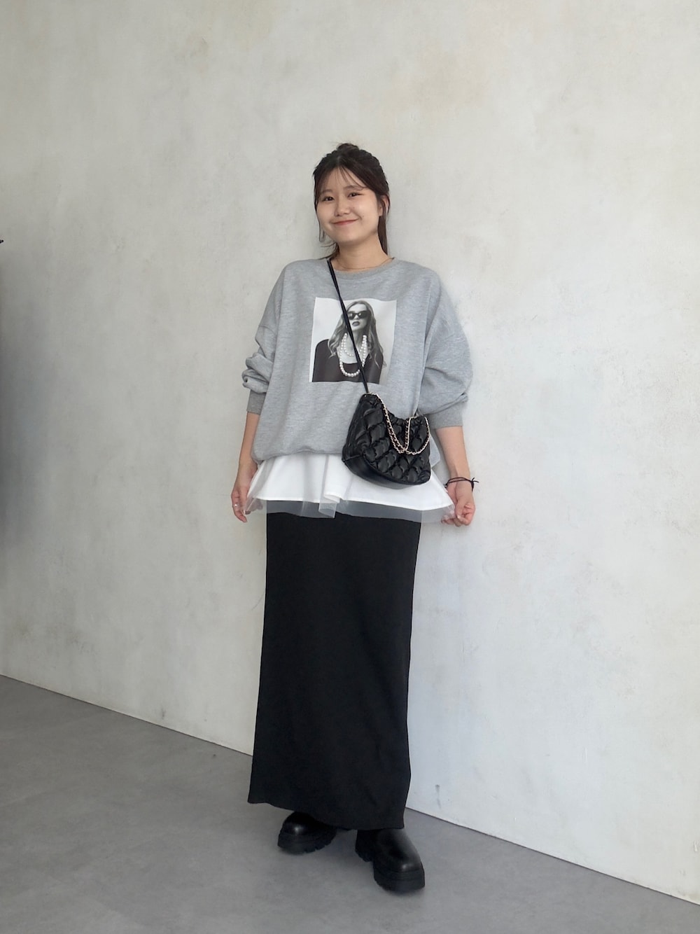 スウェットにナロースカートを合わせました! ペプラムキャミをレイヤード! シンプルながらもフォトデザインが華やかに 骨盤周りきになる私でもきれいにスカート履けました! 158cm着用 トップス:M ボトムス:TM シューズ:L