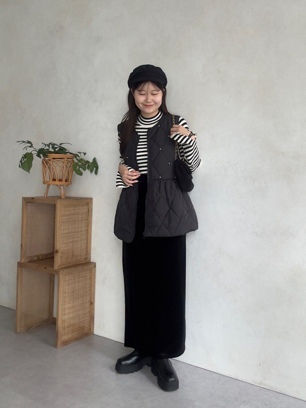 モノトーンコーデ! ペプラムジレに ナロースカートを合わせて大人っぽく! パールなどがアクセントに! 158cm着用 トップス:M ボトムス:TM シューズ:L