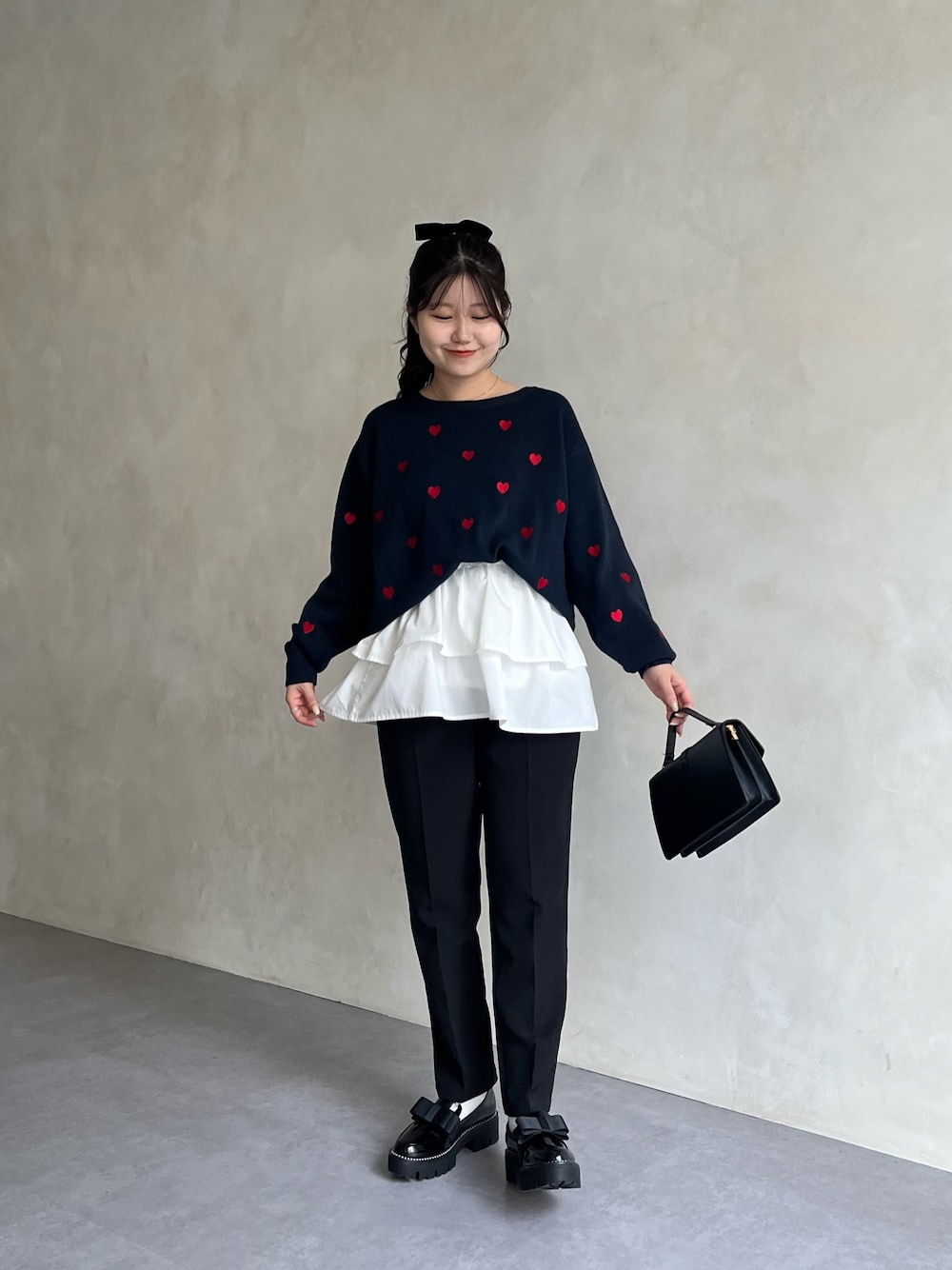 大人甘め・きれいめコーデ✨ スウェットライクニットにテーパードを合わせました! ミニスカートをレイヤードして甘さをプラス! 158cm着用 トップス:M ボトムス:M シュー