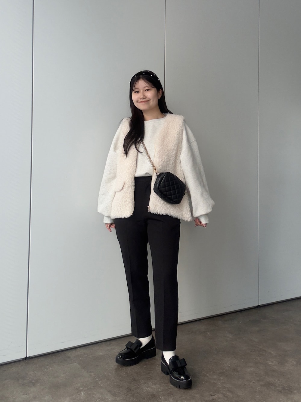 大人キレイめカジュアルコーデ! スウェットにテーパードを合わせました! ファーベストをレイヤードを重ねてカジュアルさ 甘さも出してくれます! 158cm着用 トップス:M ボトムス:M シューズ:L