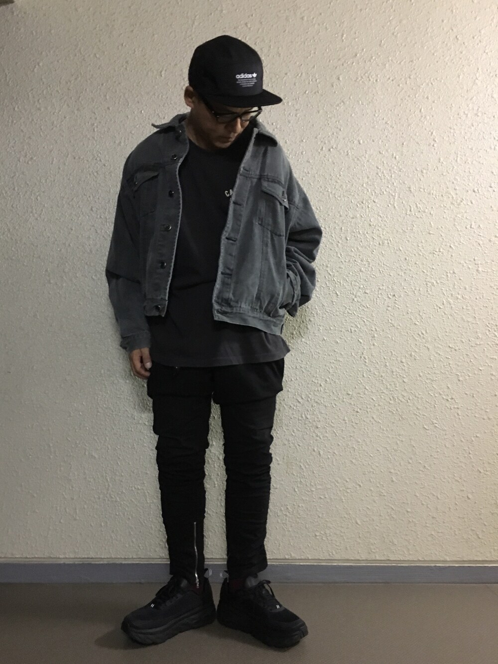 こんにちは😃 ご覧頂きありがとうございます😊 いいね☆お気に入りいつもありがとうございますっ✨✨✨ ブラック&グレーのワントーンコーデです。わかりにくいのですがソックスはボルドーです😅 たまたま見つけた古着のジャケットが色味やサイズ、シルエット、ボロさ具合😅が良くて購入したんですが…スリランカ製…あまり見ないなぁ😅でも1980円❗️ キャップは真っ直ぐなツバキャップにチャレンジー、こちらはセールでgetですー(*´艸`*)