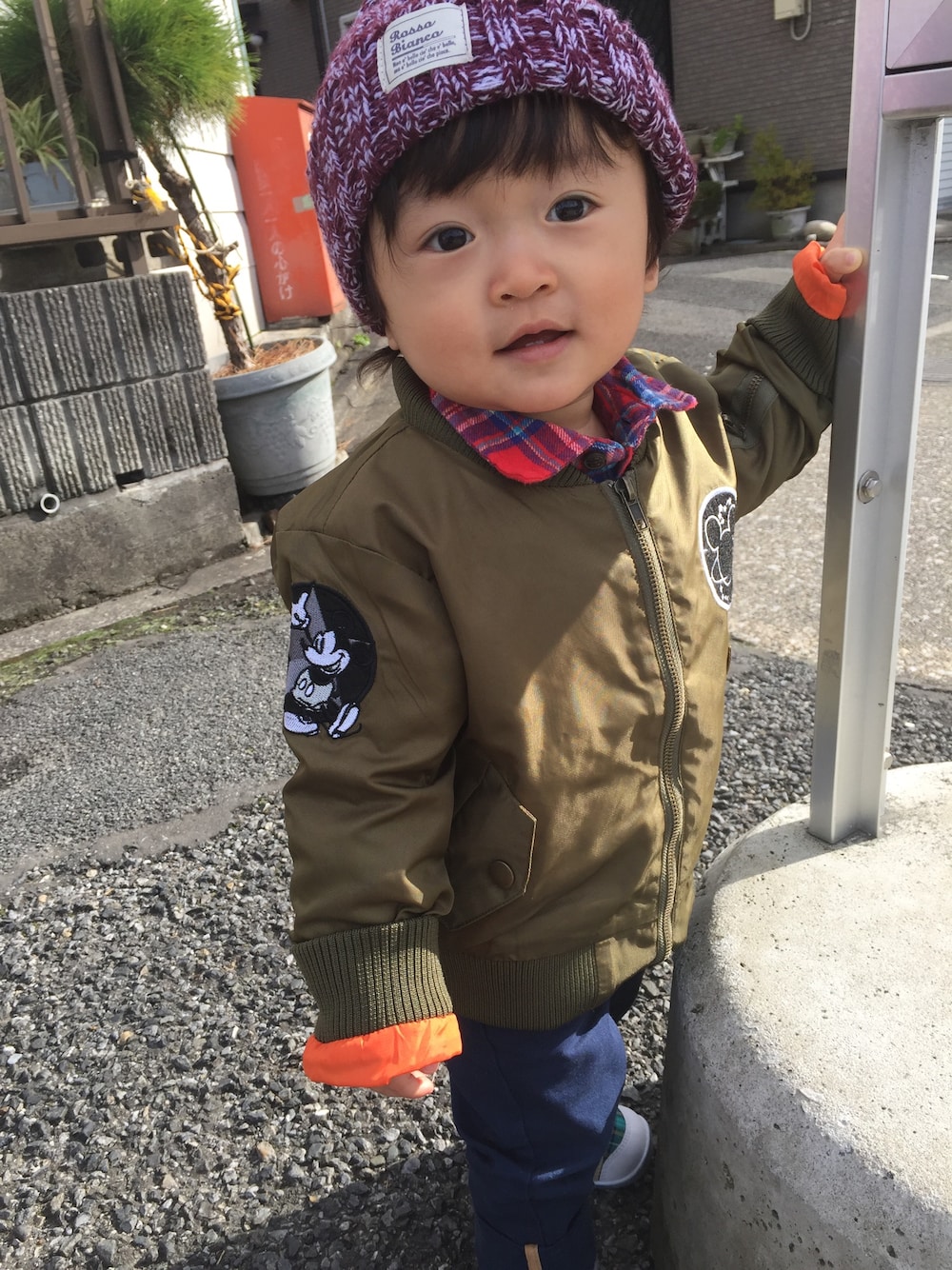 韓国子供服biquetteのミッキーMA1が可愛すぎてツボ。 そしてこの子は意外と赤が似合う、と勝手に思っている親バカママ。