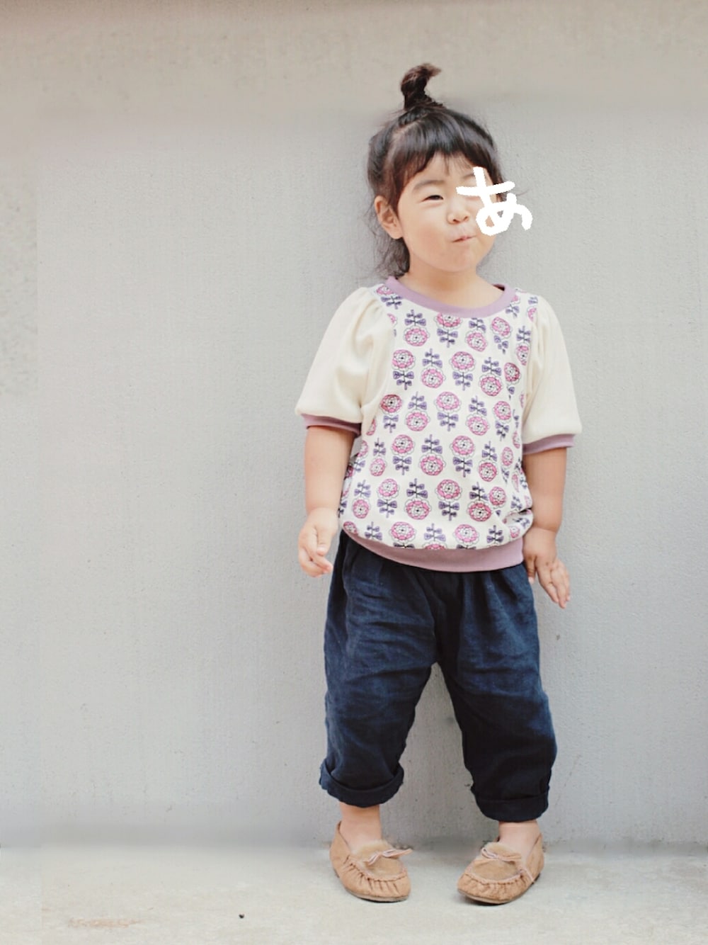 コーデ記録というより、生存報告です🙋 最近、全然写真撮らせてくれないし、 出した服もみーんな拒否だし、悲しいです😭 でも、元気です⤴ 変わらず覗いてくださる方々、ありがとうございます♥ 最近のあまねさん、ぶどう🍇好きから波及して 紫ブームが来てるので ストックの生地もパープル系が増えつつあります。 布の状態から「これ、着たい~!」と催促されていた パープルフラワーのパフスリーブTシャツ👚 これは喜んで着画撮らせてくれました✌ ■トップス………ママのHandmade:100 ■パンツ………ママのHandmade:90 ■モカシン………古着:15cm
