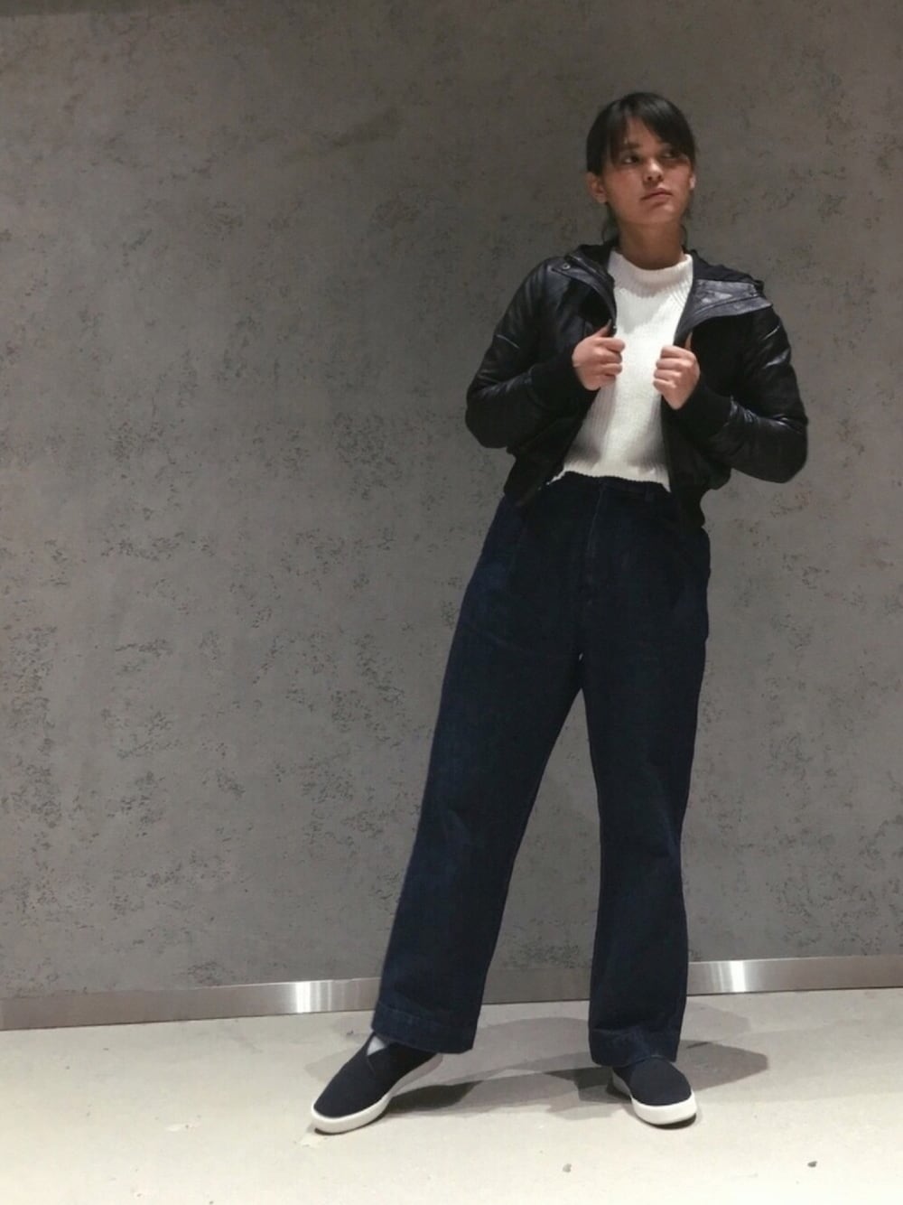 アンダーアーマーのライダースジャケットをワイドデニムと! このスリッポンちょっと変わった形で可愛い。