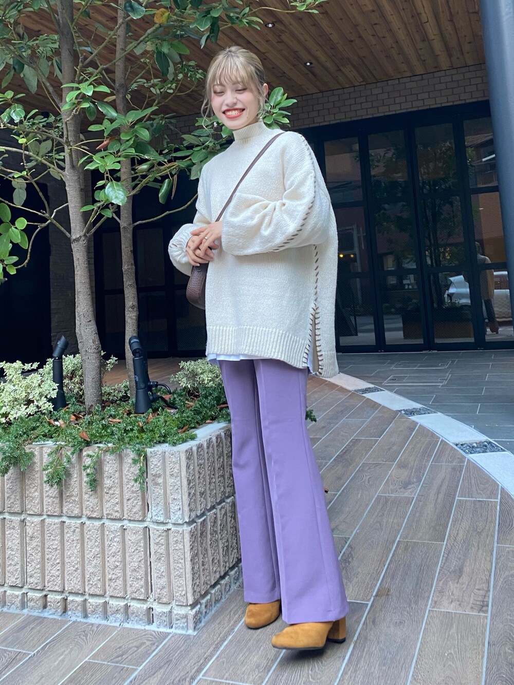 はじめまして🕊 投稿見てくださりありがとうございます🍂 今日は、刺繍ステッチのはいった白ニットにカラーパンツを合わせました🍇👖 裾スリットがはいっていて、裾まで刺繍ステッチがはいっているんです✌🏻