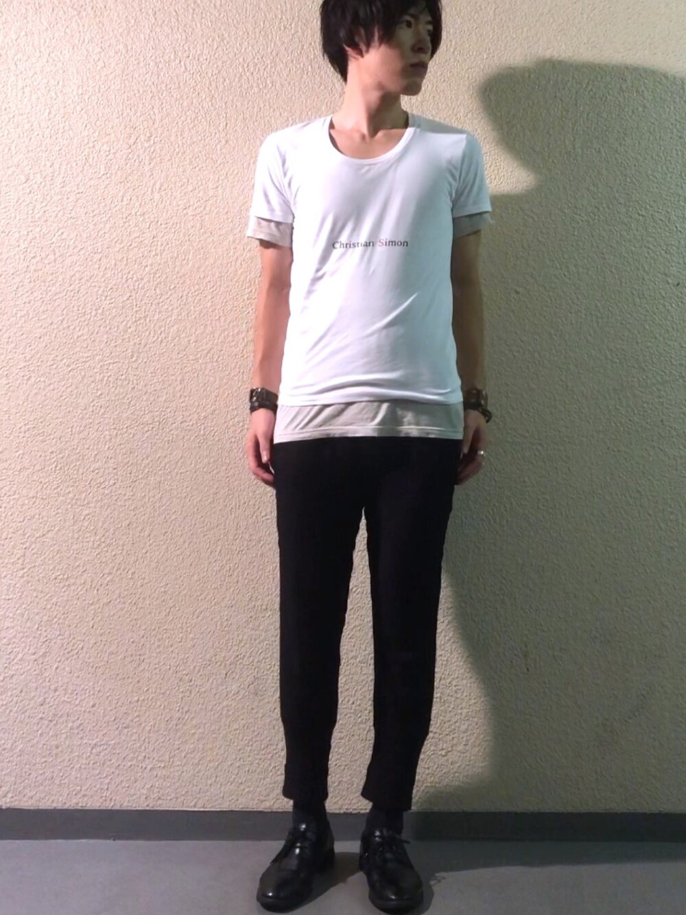オリジナルブランド「 Christian Simon」のTシャツです。服好きが転じて自分のブランド展開になりました。笑 白Tシャツは地肌が透けるので、Tシャツのレイヤードで着用しています。