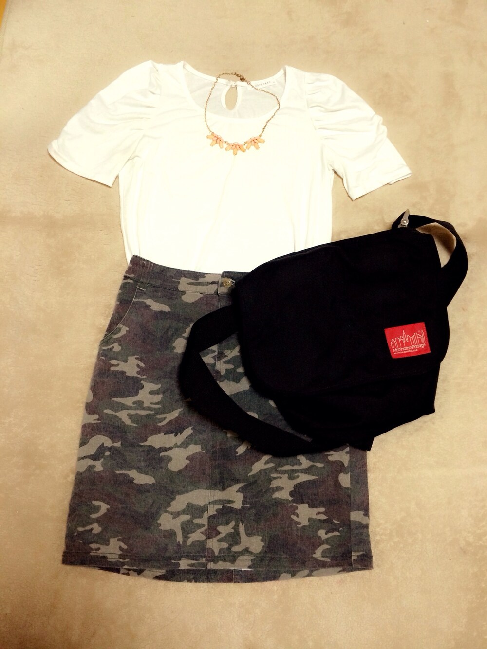トップスをシンプルにして 迷彩柄だけだキレイ系な感じに マンハッタンのショルダーバッグで外して 学生さを出しました(´-`).。oO(♡