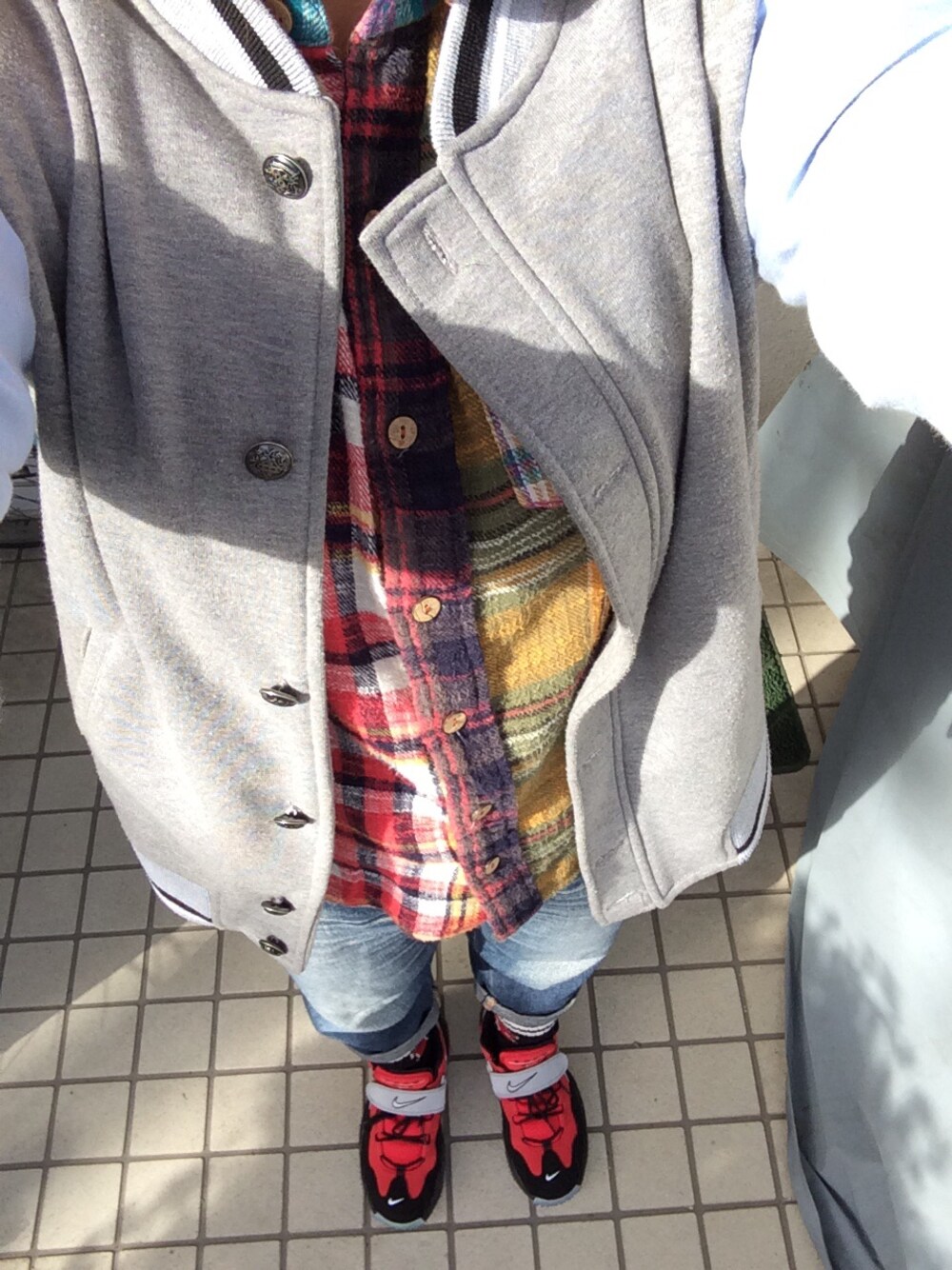 ナイキの黒×赤のシューズがポイントです:) スタジャンは袖だけシャツの生地になっていてお気に入りです☺︎
