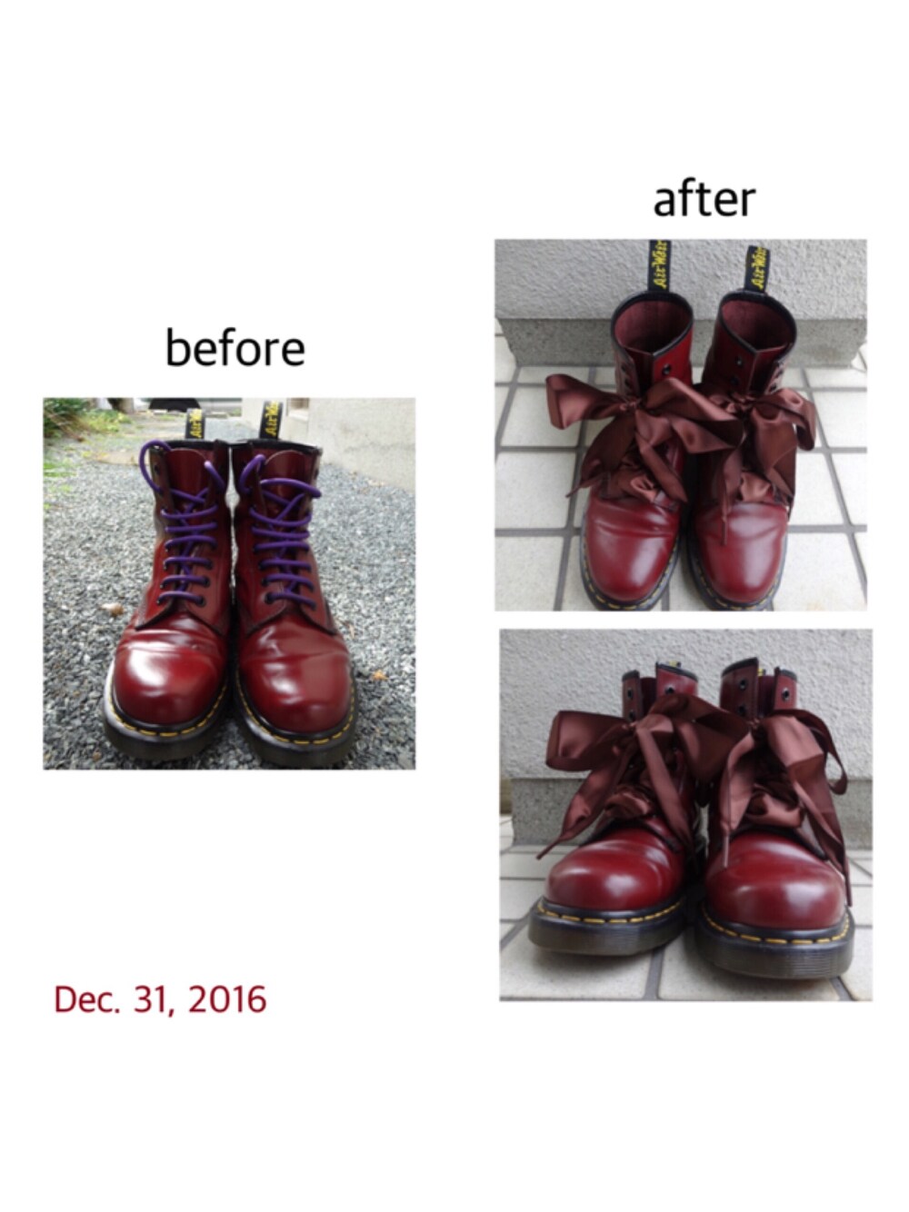 今年も今日で終わってしまいますね〜 長いようで短かった、でも濃い1年でした! さてさて、私のマーチンさんもお正月仕様になっていただこうと寝ぼけながらケアをしシューレースを変えました(。・ө・。) 成人式もマーチンさん履いていこうと思ってるのでこのリボンのシューレースに🎀