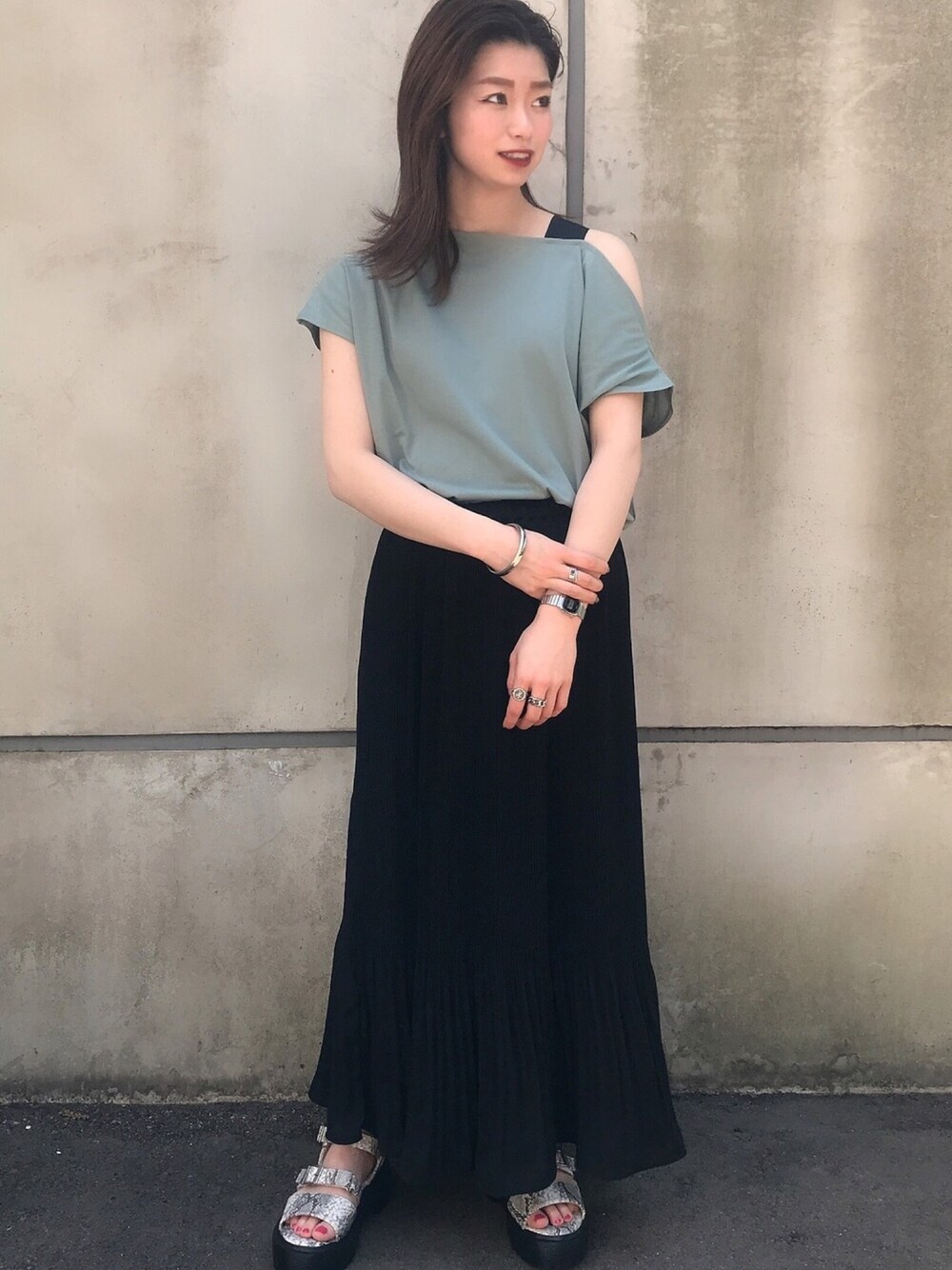 シンプルながらもトレンド感を交えたデザインは、手持ちのアイテムとも合わせやすく、オススメです👸🏼💚 〻tops p11000 ワンショルにPO ¥2,900(+tax) 〻bottom PE0752 なびくこまかプリーツSK ¥4,900(+tax) 〻shoes ZW0842 厚底フラットサンダル ¥4,900(+tax)