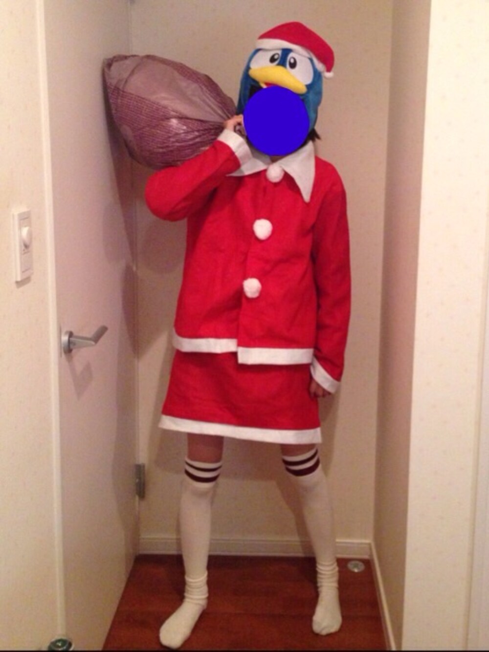 かりん渾身のXmasコーディネート! ダイソーで購入した300円のサンタコスと ドン・キホーテにて購入したドンペン。 プレゼントをおさめる袋には 庶民の味方しまむらのビーニール袋を使用。 メリークリスマス!