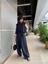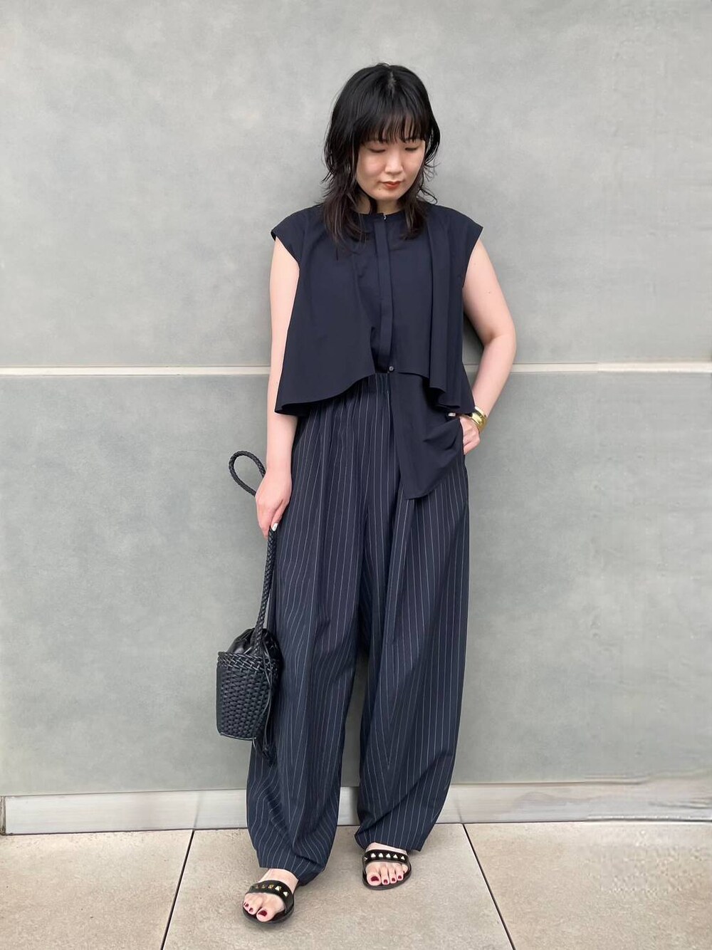 ◆コットンレイヤードブラウス ハリ感のあるコットン素材のブラウス。 前見頃にフリルのようなレイヤードデザインがあり、シンプルですが華やかな印象。 前がボタンのため様々な着方に挑戦できます。 肩まで隠れるフレンチスリーブのため1枚でも安心♪ ◆ツイルストライプドロストパンツ カレンソロジーで大人気のドロストパンツシリーズ新作です。 ウエストにドロストのついたゆったりと履きやすいパンツ。 ウールの入ったとろみのある素材が特徴でポリエステル混合素材のためご自宅で洗濯出来ます。 細いストライプの柄がシャープな印象に♪ styling ネイビー✖︎ネイビーのシンプルなワントーンコーデです。 ハリ感のあるブラウスにオチ感のあるボリュームボトムを合わせてニュアンス感のあるスタイリングを目指しました。 夏でも重くならず爽やかに着こなしたい方におすすめ♪