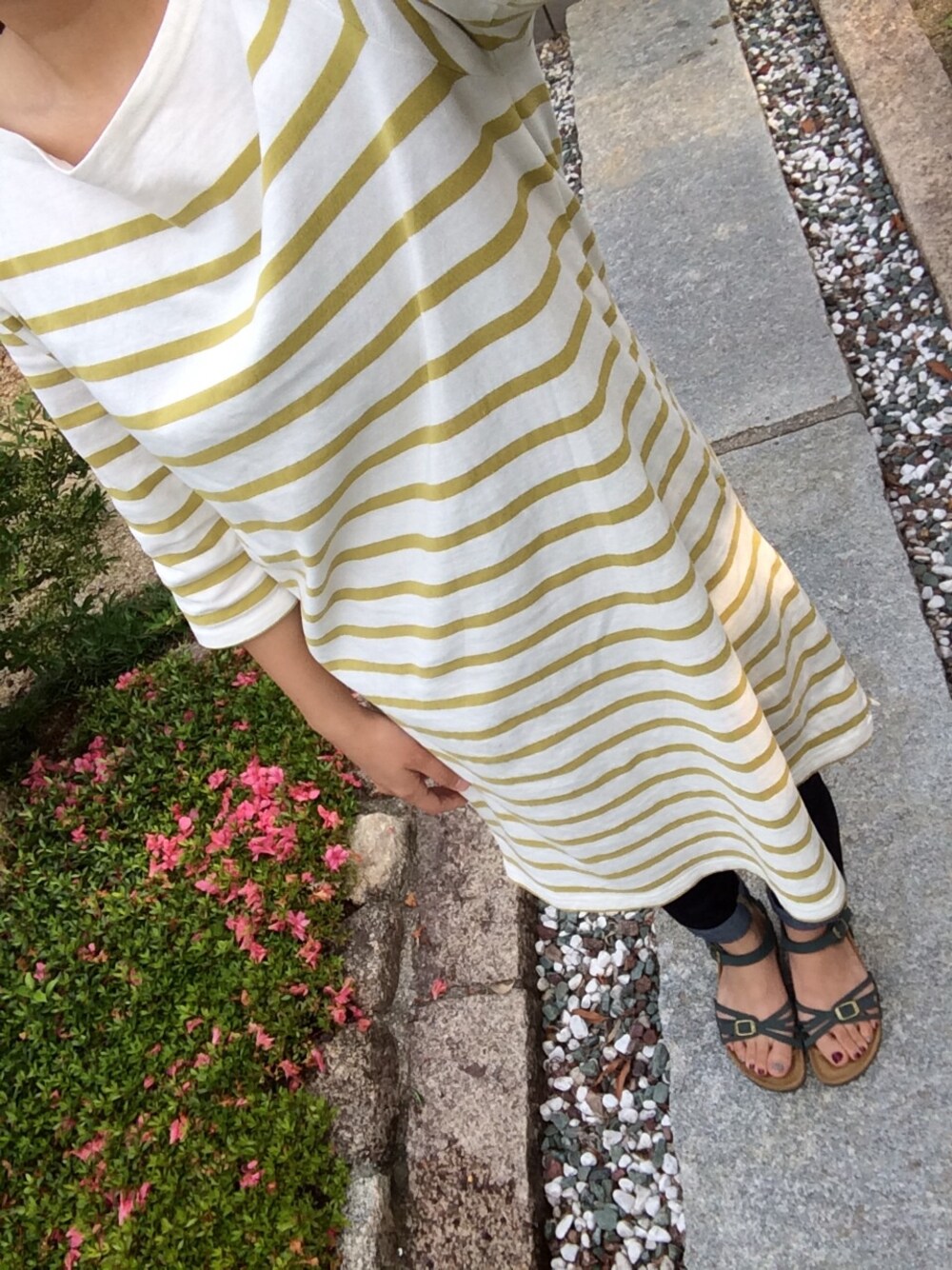 いつしかのおうちコーデ▽ やっぱり無印のこのボーダー らくちんで好きやわ(^_^)☆ ワンピース:無印 スキニー:G.U